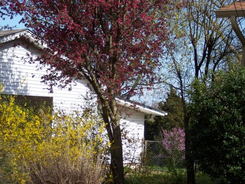 Jim, you ought to come visit. We have a yellow warbler, rufous-sided towhees, a cuckoo, and a bald eagle. And some others that I can't identify yet. The blossoms on the ugly tree were too big for red bud. A neighbor has a larger version of the same tree. Some day I might knock on the door and ask what it is.